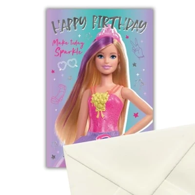 BARBIE: This Barbie Birthday Card reads on the front reads "Happy Birthday Make Today Sparkle Barbie ". The Inside message reads "Wishing you a Magical Day" Leaving plenty of room for your own message. OFFICIALLY LICENSED: Our fully licensed range of Valentine's Day cards, Mother's Day cards, Father's Day cards, Christmas cards, Birthday cards and occasional cards will bring a smile those receiving them. We also sell a wide variety of fully licensed gift bags, and wrapping paper as well! ENVIRONMENTALLY FRIENDLY: Great for the Environment: Our Cards are made of FSC Certified Paper that has passed the highest Environmental Regulation checks. All cards comes with an envelope which is fully recyclable. EUROPE'S NUMBER ONE: Brought to you by Europe's Number One Licensed Publisher: Every Danilo product is 100% Officially Licensed. This guarantees the product has been approved by the Acts themselves and features the current and most up to date designs DIMENSIONS: Dimensions of this products are 7 inches X 6 inches, each card comes with a suitable sized envelope as well