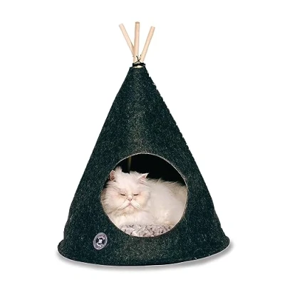 Perfect place for your cat to escape and relax. Made with a soft felt effect grey fabric. Sumptuous faux fur cushion. 100% natural wooden tent poles. One size: 55 x 55 x 64cm.