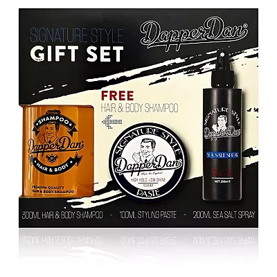 COMPLETE GROOMING COLLECTION: The Dapper Dan Signature Style Gift Set includes a high hold, low shine Signature Style Paste, a texturizing Signature Style Sea Salt Spray, and a Vitamin B5-enriched Hair and Body Shampoo, providing a comprehensive range of premium grooming essentials. VERSATILE STYLING OPTIONS: From classic, slick-backed looks to relaxed, tousled styles, this gift set empowers you to express your individuality with confidence, offering a wide array of styling options for every occasion. THOUGHTFULLY CURATED: Each product in this set is carefully selected to complement one another, ensuring a cohesive and refined grooming experience that embodies timeless sophistication. PREMIUM QUALITY: Presented in a sleek and sophisticated package, the Dapper Dan Signature Style Gift Set offers more than just grooming products; it provides an experience of refined luxury, making it an ideal gift for yourself or a discerning gentleman in your life. HASSLE FREE GROOMING: Each product in the set offers easy application methods, ensuring a hassle-free grooming routine and enabling effortless styling for achieving personalized looks.