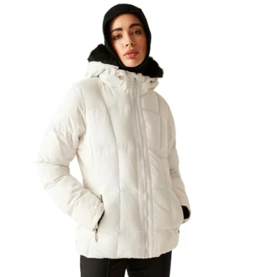Dare2b Glamorize VI insulated ski jacket for women. A midweight, insulated jacket designed for piste days and seasonal wear, combining waterproof protection with breathable fabric and practical on-mountain details. The shell is rated to 10,000 mm H2O, providing reliable waterproofing in typical alpine conditions while allowing moisture to escape through a breathable construction. Insulation delivers warmth without excessive bulk, and the cut supports freedom of movement for skiing and general winter activity. Functional features include a fixed snow skirt to keep out powder and a detachable, adjustable hood with a removable faux fur trim for versatile coverage and a neater silhouette when required. Inner pockets and a dedicated ski pass pocket keep essentials organised. A built-in goggle cleaner is integrated into the jacket for quick maintenance on the slopes. Practical finishing touches include an adjustable hem and stretch cuffs to seal out draughts and improve fit. The lining uses mesh panels in key zones to aid ventilation and comfort during active use. Fabric, lining and padding are 100% polyester, with recycled polyester elements and a PFC free treatment, reflecting a reduced chemical footprint compared with conventional finishes. The overall specification makes the Glamorize VI a dependable waterproof, breathable insulated ski jacket for women who want straightforward performance and considered detailing.