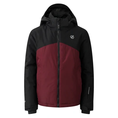 Dare2b Impose V insulated ski jacket for kids. A practical, insulated outer layer designed for young skiers and winter play, combining waterproof protection with breathability and a mid-weight insulating fill. Constructed from recycled polyester with ARED treatment and a PFC free durable water repellent, the shell delivers a water column of 15,000 mm H2O and breathability of 15,000 g/m²/24h. All seams are fully taped to maintain waterproof integrity in wet snow and sleet. Insulation is polyester padding with a breathable mesh lining. The jacket is rated Warm level 4, providing reliable thermal performance for colder days while allowing moisture to escape during activity. Practical features include a fixed hood with adjustable settings, a chin protector on the front zip, and a fixed snow gaiter to keep out snow. Cuffs are adjustable with stretch inner cuffs for comfort and a secure fit. Storage comprises inner pockets and a dedicated ski pass pocket, and an integrated goggle cleaner is provided on the jacket. The cut allows room for a base layer and a mid layer underneath without restricting movement. Materials for shell, lining and padding are 100% polyester, chosen for durability and easy care, while recycled content and PFC free treatment reduce environmental impact.