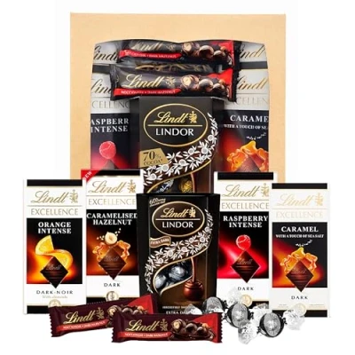 Indulge in the rich and decadent world of Dark Lindt Chocolates Gift Box. Perfect for Christmas sweets hamper, gifting, this bundle of delight features an assortment of irresistible smooth chocolate bars, a lavish truffles gift box, crunchy hazelnut bars, and a thoughtful Topline gift card. Assorted chocolate bulk: revel in the blissful experience of finest chocolates. Irresistible bundle includes a variety of chocolates: Extra Dark Chocolate Truffles 200g, 4 x 100g Excellence Dark chocolate bars: orange, dark raspberry, caramel sea salt, caramelised hazelnut & 2 x 35g Dark hazelnut bars, comes with Topline Gift Card. Perfect of gifting: surprise your loved ones with the ultimate holiday treat! Chocolate bulk makes for fantastic Secret Santa gifts, charming stocking fillers hamper boxs or delightful additions to party bag fillers. The joy of receiving chocolate hamper is unparalleled, making it a memorable gift for chocolate lovers of all ages. Experience the unmatched pleasure of signature milk chocolate bars. Each bite is a celebration of smoothness, delivering a decadent experience that captivates your taste buds. Whether you're treating yourself or sharing the joy with others, these bars are the perfect way to sweeten your Christmas festivities. Give the Novelty gift of this Christmas and make the holiday season even more memorable with these exquisite chocolates. Order your Sweet Hamper today and add a touch of Swiss chocolate magic to your festivities!