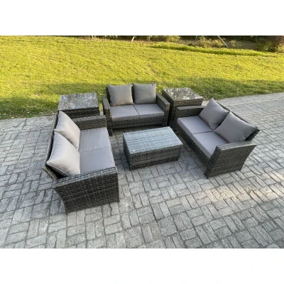Dark Grey 6 Seater Outdoor Rattan Garden Furniture Set Patio Love Sofa Rectangular Coffee Table with 2 Side Tables Fimous