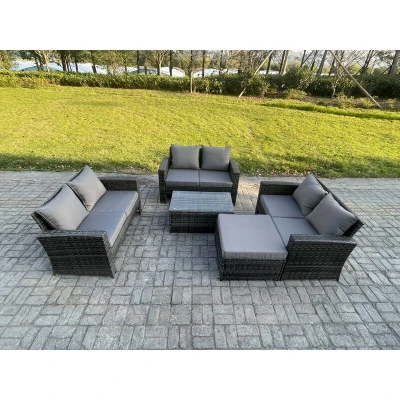 Dark Grey 7 Seater Outdoor Rattan Garden Furniture Set Patio Love Sofa Rectangular Coffee Table with Big Footstool Fimous