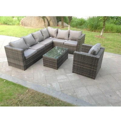 General description This classic L-shaped corner sofa set is designed to accommodate up to 7 people, featuring comfortable and soft cushion backs. Made from premium dark grey rattan, it is built to withstand British weather conditions. Technical specifications Double armrest sofa size: 176W x 65D x 66H cm Single armrest sofa size: 166W x 65D x 66H cm Table size: 80L x 50W x 37H cm Chair size: 74W x 65D x 66H cm Material: Dark grey mixed rattan with dark grey fabric Seat cushion thickness: 8 cm Glass thickness: 5 mm tempered glass Installation Items come flat packed and are easy to assemble. Sturdy galvanized steel tube metal frames with powder coating to prevent rust. Usage Low maintenance with removable cushion covers. Recommended to keep cushions indoors or use a rain cover when not in use. Cover the furniture with a rain cover if not used for an extended period. Other information Factory direct sale guarantees quality and after-sale service. Important notice: Check the product