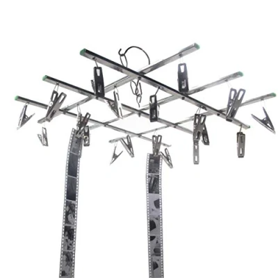 Material: Stainless steel. Features: 1. Flat mouth clips will allow to hang films tightly but no indentation marks or scratches leaving on the film surface. 2. 20pcs separated clips will come with for bottom straightening. 20pcs fixed clips on the top to sure the safe distance between films. 3. 360 degree rotation to select and view films situation, save time and more convenient. 4.this rack come with windproof clips to avoid rack out of bar due to excessive wind. Design for 135,120, 4x5" film air-dry, make film surface flat and neat, it’s convenient for processing and observe film Brand: eTone Package: 1x film hanger (with 20pcs fixed clips), 20x clips. Films not included.