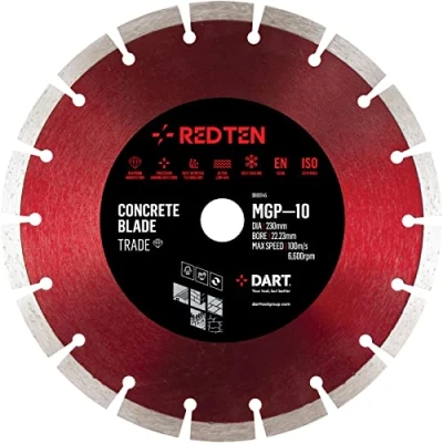 Tradesman's Performance Blade: If you need a trade performance concrete and general purpose blade, try the DART Red Ten MGP-10 Concrete Disc Cutter Diamond Blade. With a precision engineered core, dust removal system, and self cooling, this diamond cutting disc will see you through many jobs. Tough Diamond Cutting Disc: DART diamond blades are sturdy with an outstanding lifespan. The synthetic diamond on the blade's edge delivers an excellent cutting performance and finish. Large Segment Height: With a 10mm segment height, these cutting discs have impressive cutting speeds and a long service life. Effective Concrete Cutting Discs: The blades are suiting for cutting concrete products, unabrasive bricks, paving, stone, and roof tiles Quality Guaranteed: The diamond cutting disc is EN13236 certified and ISO9001 accredited., Manufacturer: DART