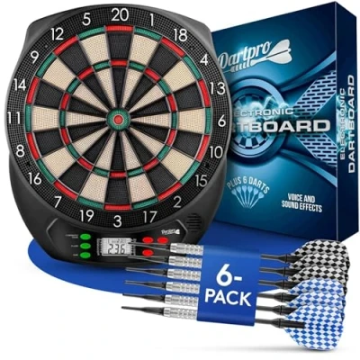 🎯 𝐔𝐏 𝐓𝐎 𝟖 𝐏𝐋𝐀𝐘𝐄𝐑𝐒 – DartPro's electronic dartboard delivers pure game-night excitement. Up to 8 players can compete simultaneously, and from 4 players onward, teams of 2 can battle head-to-head for ultimate group fun! 🎯 𝐁𝐀𝐓𝐓𝐄𝐑𝐘 𝐎𝐑 𝐀𝐃𝐀𝐏𝐓𝐄𝐑 𝐏𝐎𝐖𝐄𝐑𝐄𝐃 – This e-dartboard runs wirelessly on batteries or via the included power adapter for permanent use. Also included: 6 soft tip darts and 100 replacement tips for endless play! 🎯 𝟔𝟓 𝐆𝐀𝐌𝐄 𝐕𝐀𝐑𝐈𝐀𝐍𝐓𝐒 – Perfect for game nights with friends and family. The built-in computer offers 65 exciting dart games plus a dedicated button to activate Double In and Double Out modes! 🎯 𝐋𝐂𝐃 𝐒𝐂𝐎𝐑𝐄 𝐃𝐈𝐒𝐏𝐋𝐀𝐘 – The integrated LCD display keeps all scores clearly visible at a glance. Responsive sensors and exclusive voice callouts plus sound effects bring authentic tournament atmosphere home! 🎯 𝐖𝐈𝐃𝐄 𝐂𝐀𝐓𝐂𝐇 𝐑𝐈𝐍𝐆 – The extra-wide catch ring protects walls from bouncing darts by providing a larger surface area. Simply hang up and start playing immediately thanks to practical plug-and-play setup!