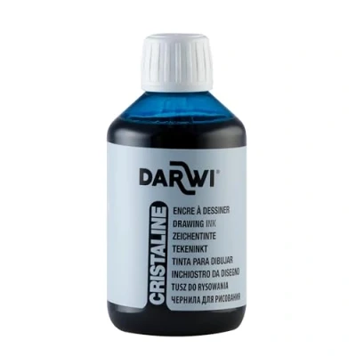 USAGE: Based on dye, drawing ink is mainly used in artistic and school fields (Watercolor, illustrations, lettering and calligraphy) Description: Intense and bright, water-based ink is easy to apply and does not leave a brush mark. It colours without disappearing drawings with pencil, wax or greasy pastel. 250 ml bottle TIP: To lighten tones, inks can be diluted with distilled water You can add white ink to obtain pastel and opaque tones Colour: light blue (range includes 14 shades) MANUFACTURING: DARWI inks are made in Belgium, near Liège