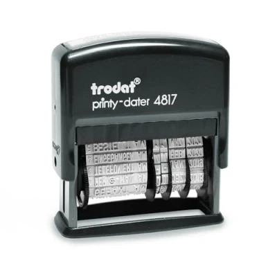 This stamp combines the date with various texts or commercial formulas - Text and date change is done by turning the wheels, text or numbers of which are easy to read and adjust Commercial texts or formulas: RECEIVED, INVOICED, PAID, COLLECTED, SHIPPED, FAX, DELIVERED, REVISED, COMPLIED, PRINTED, DUPLICATED, URGENT — The total size of the print is 48 x 3.8 mm The built-in ink cartridge does not dry out and can be replaced easily and without danger of staining; The ink cartridge ref. 6/4817 is available in 5 colors: black, blue, red, green and purple The ink is suitable for documents according to the standard DIN14145-2, that is, it dries quickly, does not smudge and cannot be removed without being noticed This seal is part of the concept Trodat in which the main range is environmentally friendly and climate-neutral