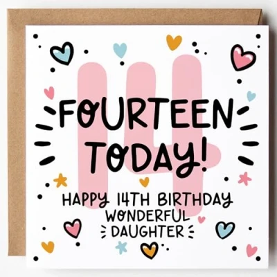 Daughter 14th Birthday Card 14 Today for Cute & Trendy Design Blank Inside With Kraft Envelope (Age (Fourteen Today))