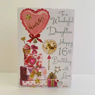 onny Javelin Daughter 16th Birthday Card & Envelope - Pink Heart Balloon and Gifts with Glitter and Embossed Silver Foil Approximate Size: 9" x 6.25" (23cm x 16cm) On the front the card reads: To a Wonderful Daughter Happy 16th Birthday With Love & inside has an insert printed with the same design and reads: Time to have a Party! With laughter All the way! Let's Cheer a Gorgeous Daughter as You turn Sixteen Today! Loving Birthday Wishes