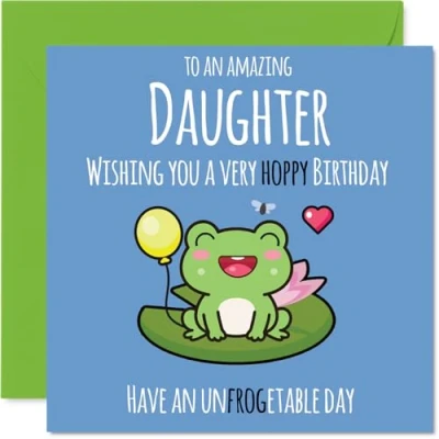 MAKE YOUR DAUGHTER SMILE WITH THIS UNIQUE BIRTHDAY CARD: This exceptional quality Daughter birthday card shows the design 'To an amazing Daughter Wishing you a very hoppy birthday. Have an unfrogetable day'. If you are looking for a beautiful birthday card Daughter, then then this happy birthday Daughter card is bound to make them smile. Not just a birthday card for Daughter this could also be a birthday gifts for Daughter, Step Daughter or Daughter in Law. WHAT DO YOU GET: The card is printed on one side and BLANK ON THE INSIDE to allow you to write your very own message. The unique fun design is printed on a specially sourced and environmentally responsible board. At 360 microns thick the natural white one-sided gloss board has a quality look and feel. Supplied with a coloured gummed envelope to complement the design and ready to be sealed and sent in the post. Daughter Bday cards, Step Daughter birthday cards, Daughter in Law birthday card. NO INK SMUDGES: There is nothing worse than writing inside a card to find that the shiny surface makes the ink smudge. This is why we use a high quality one sided coated board. The uncoated side will absorb more of the ink from your pen to make smudging a thing of the past. Daughter birthday cards, Daughter birthday cards from Dad. SIZES: Greeting Card = 145mm x 145mm, Envelope = 155mm x 155mm, Card Thickness = 360 micron. Happy birthday Daughter, Daughters birthday card, Daughter cards birthday, birthday card Daughter, happy birthday Daughter card, Daughter gifts from Dad. MADE AND QUALITY CHECKED IN THE UK: We print and manufacture all our products right here in the UK so you can be sure of a fast turnaround and a product that is expertly made. Using environmentally responsible premium board our card is conscious of the responsible management of the world's forests - happy birthday card Daughter, Daughter birthday cards.