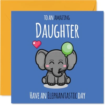 MAKE YOUR DAUGHTER SMILE WITH THIS UNIQUE BIRTHDAY CARD: This exceptional quality Daughter birthday card shows the design 'To An Amazing Daughter Have An Elephantastic Day'. If you are looking for an awesome birthday card for Daughter, then then this happy birthday Daughter card is bound to make them smile. Not just a birthday card for Daughter this could also be a birthday gifts for Daughter, Step Daughter or Daughter in Law. WHAT DO YOU GET: The card is printed on one side and BLANK ON THE INSIDE to allow you to write your very own message. The unique fun design is printed on a specially sourced and environmentally responsible board. At 360 microns thick the natural white one-sided gloss board has a quality look and feel. Supplied with a coloured gummed envelope to complement the design and ready to be sealed and sent in the post. Great Daughter birthday cards, Step Daughter birthday card. NO INK SMUDGES: There is nothing worse than writing inside a card to find that the shiny surface makes the ink smudge. This is why we use a high quality one sided coated board. The uncoated side will absorb more of the ink from your pen to make smudging a thing of the past. Daughter birthday cards, Daughter birthday cards from Dad. SIZES: Greeting Card = 145mm x 145mm, Envelope = 155mm x 155mm, Card Thickness = 360 micron. Happy birthday Daughter, Daughters birthday card, Daughter cards birthday, birthday card Daughter, happy birthday Daughter card, Daughter gifts from Dad. MADE AND QUALITY CHECKED IN THE UK: We print and manufacture all our products right here in the UK so you can be sure of a fast turnaround and a product that is expertly made. Using environmentally responsible premium board our card is conscious of the responsible management of the world's forests - happy birthday card Daughter, Daughter birthday cards.