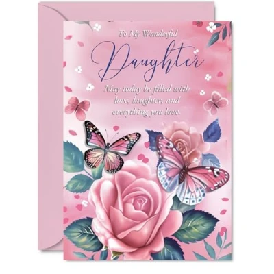 Daughter Birthday Card Pink Rose Butterfly Beautiful Happy for from Mum Dad, A5 Female Floral Bday Greeting Cards