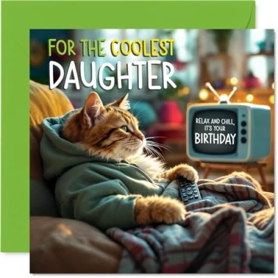 Daughter Birthday Card TV Cat Happy for from Dad Mum, 145mm Celebration Bday Greeting Cards