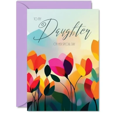 Dazzle your Daughter with joy using our exquisite Happy Birthday Card Daughter; a premium quality masterpiece that features a captivating design saying 'To My Daughter On Her Special Day'. The vibrant colours on this card make it stand out, ensuring it's not just a card but a beautiful keepsake. It's a Personal Gift that shows your Daughter how much you care and the perfect way to express your love and appreciation on her special day. What's Inside: Delve into a world of elegance with the inside print showcasing a lovely verse, 'May you have a fantastic day filled with joy, laughter and all the things...' as seen in the second image. There's ample space for your personal message. Crafted on a 360-micron thick environmentally responsible board, this one-sided gloss board offers a luxurious look and feel. Paired with a colored gummed envelope that complements the design, making it a truly special birthday gesture. Ink Perfection: Say goodbye to ink smudges! Our high-quality one-sided coated board ensures a smooth writing experience without the worry of smudging. The uncoated side absorbs ink, providing a flawless finish that adds to the card's overall premium quality. Daughter birthday cards, ladies birthday card, womens birthday card, Female birthday cards. Dimensions that Impress: Greet with grandeur using a card sized at 148mm x 210mm, accompanied by an envelope measuring 150mm x 212mm. The card boasts a thickness of 360 microns, ensuring a substantial and impressive presence. Daughter birthday card, happy birthday Daughter card, birthday card Female, summer birthday cards for women, birthday card flowers. British Craftsmanship: Proudly crafted and quality-checked in the UK, our birthday cards are a testament to expert design and manufacturing. Utilizing Forest Stewardship Council certified board, we contribute to responsible forest management. Expect a swift turnaround and a product that reflects the highest standards of quality. Daughter birthday cards, Female birthday cards adult, floral birthday card.