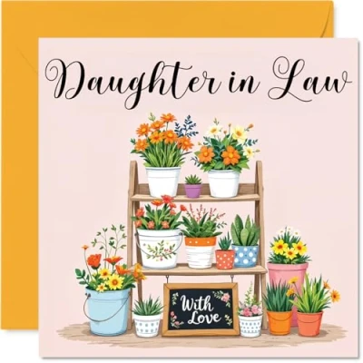 MAKE YOUR DAUGHTER IN LAW SMILE WITH THIS UNIQUE BIRTHDAY CARD: This exceptional quality Daughter in Law birthday card for her shows the design 'Daughter in Law With Love'. If you are looking for a beautiful birthday card Daughter in Law for her, then then this happy birthday Daughter in Law card is bound to make her smile. Not just a birthday card for Daughter in Law this could also be a birthday gifts for Daughter in Law, Daughter or Step Daughter. WHAT DO YOU GET: The card is printed on one side and BLANK ON THE INSIDE to allow you to write your very own message. The unique fun design is printed on a specially sourced and environmentally responsible board. At 360 microns thick the natural white one-sided gloss board has a quality look and feel. Supplied with a coloured gummed envelope to complement the design and ready to be sealed and sent in the post. Great Daughter in Law birthday cards, Daughter birthday card. NO INK SMUDGES: There is nothing worse than writing inside a card to find that the shiny surface makes the ink smudge. This is why we use a high quality one sided coated board. The uncoated side will absorb more of the ink from your pen to make smudging a thing of the past. Daughter in Law birthday cards, Daughter in Law birthday cards from Father Dad. SIZES: Greeting Card = 145mm x 145mm, Envelope = 155mm x 155mm, Card Thickness = 360 micron. Happy birthday Daughter in Law, Daughter in Laws birthday card, Daughter in Law cards birthday, birthday card Daughter in Law, happy birthday Daughter in Law card, Daughter in Law gifts from Father Dad. MADE AND QUALITY CHECKED IN THE UK: We print and manufacture all our products right here in the UK so you can be sure of a fast turnaround and a product that is expertly made. Using environmentally responsible premium board our card is conscious of the responsible management of the world's forests - happy birthday card Daughter in Law, Daughter in Law birthday cards.