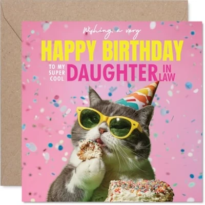 MAKE YOUR DAUGHTER IN LAW SMILE WITH THIS UNIQUE BIRTHDAY CARD: This exceptional quality Daughter in Law birthday card for her shows the design 'Wishing a very Happy Birthday to my super cool Daughter in Law'. If you are looking for a beautiful birthday card Daughter in Law for her, then then this happy birthday Daughter in Law card is bound to make her smile. Not just a birthday card for Daughter in Law this could also be a birthday gifts for Daughter in Law, Daughter or Step Daughter. WHAT DO YOU GET: The cards are printed on both sides with the inside print saying 'Have an Amazing Day' and ample space for your own personal message. The unique fun design is printed on a specially sourced and environmentally responsible board. At 360 microns thick the natural white one-sided gloss board has a quality look and feel. Supplied with a coloured gummed envelope to complement the design and ready to be sealed and sent in the post. NO INK SMUDGES: There is nothing worse than writing inside a card to find that the shiny surface makes the ink smudge. This is why we use a high quality one sided coated board. The uncoated side will absorb more of the ink from your pen to make smudging a thing of the past. Daughter in Law birthday cards, Daughter in Law birthday cards from Father Dad. SIZES: Greeting Card = 145mm x 145mm, Envelope = 155mm x 155mm, Card Thickness = 360 micron. Happy birthday Daughter in Law, Daughter in Laws birthday card, Daughter in Law cards birthday, birthday card Daughter in Law, happy birthday Daughter in Law card, Daughter in Law gifts from Father Dad. MADE AND QUALITY CHECKED IN THE UK: We print and manufacture all our products right here in the UK so you can be sure of a fast turnaround and a product that is expertly made. Using environmentally responsible premium board our card is conscious of the responsible management of the world's forests - happy birthday card Daughter in Law, Daughter in Law birthday cards.