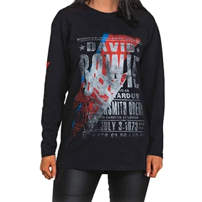 An official licensed soft-style cotton Long Sleeved Tee featuring the David Bowie 'Hammersmith Odeon' motif; This high quality garment is available in a black colorway Long Sleeves soft-style cotton