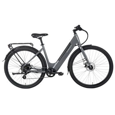 The Dawes Scenic Low Step electric hybrid bike boasts a minimalist design perfect for urban and scenic rides. Its 375Wh battery offers up to 64km (40 miles) of range and recharges in 5 hours, with on or off-bike charging for convenience and security. Powered by a Bafang rear hub motor with 32nm torque, it handles hills effortlessly. The bike features five power modes and a walk assist mode via a user-friendly handlebar display. Equipped with a 7-speed Shimano Altus gear system, reliable cable disc brakes, and puncture-resistant 700x45c tires, it ensures a smooth ride. Comfort is enhanced with ergonomic grips and a Selle Royal Freeway saddle. Additional features include a pannier rack, full-length mudguards, and a kickstand.