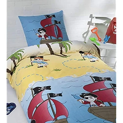 Care: – Easy care – Machine washable at 40 °C, Tumble Dry possible 100% cotton very soft and comfortable. Choose what is best for your child, with this duvet cover on the island of Pirates. dimensions: 140 x 200 x 50 cm for Duvet Cover and 60 x 70 cm for Pillowcase Set of Duvet Cover and matching Pillowcase