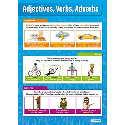 EDUCATIONAL CHART DESIGNED BY TEACHERS: Our Adjectives, Verbs & Adverbs poster helps students to learn, engage and remember more information than ever before. Covering the basics of these fundamentally important word types, this unique school poster can play a vital role in improving both students' understanding and classroom décor. SUPPLEMENT KNOWLEDGE: Our educational school posters are colourful, beautifully illustrated and contain a huge amount of valuable information. This English poster is specifically designed to help students gain a greater understanding of adjectives, verbs and adverbs. The wall chart is a great resource for Schools, Classrooms, English Teachers, Students, Tutors, Home School Parents and Home School Kids. MAKE LEARNING FUN: Engaging, clear and colourful designs and images create a fun learning environment in which students can excel. Our amazing wall posters can help to increase students’ interest towards English, while recapping any key information they've been taught. LARGE SIZE – IDEAL FOR READING FROM A DISTANCE: Our school wall charts are a generous size, measuring 850mm x 594mm (A1). This ensures all posters are easily readable from a distance. Our educational posters are a fantastic way of brightening and decorating any classroom and can easily complement every type of learning environment. Brought to you by Daydream Education, provider of educational posters for schools, with a range that spans over 25 subjects across key stages 1 – 5. By combining a bold, visual approach with simple, concise information, we have provided over five million resources to more than 50,000 classrooms worldwide.