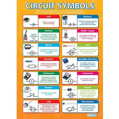 EDUCATIONAL CHART DESIGNED BY TEACHERS: Our Circuit Symbols poster helps students to learn, engage and remember more information than ever before. Covering the basic symbols used to create electrical circuits, this unique school poster can play a vital role in improving both students' understanding and classroom décor. SUPPLEMENT KNOWLEDGE: Our educational school posters are colourful, beautifully illustrated and contain a huge amount of valuable information. This Science poster is specifically designed to help students gain a greater understanding of the symbols used to create electrical symbols. The wall chart is a great resource for Schools, Classrooms, Science Teachers, Students, Tutors, Home School Parents and Home School Kids. MAKE LEARNING FUN: Engaging, clear and colourful designs and images create a fun learning environment in which students can excel. Our amazing wall posters can help to increase students†interest towards Science, while recapping any key information they've been taught. LARGE SIZE – IDEAL FOR READING FROM A DISTANCE: Our school wall charts are a generous size, measuring 850mm x 594mm (A1). This ensures all posters are easily readable from a distance. Our educational posters are a fantastic way of brightening and decorating any classroom and can easily complement every type of learning environment. THE UKâ€s NO. 1 PROVIDER: Brought to you by Daydream Education, the UK's leading provider of educational posters for schools, with a range that spans over 25 subjects across key stages 1 – 5. By combining a bold, visual approach with simple, concise information, we have provided over five million resources to more than 50,000 classrooms worldwide.