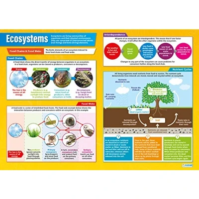EDUCATIONAL CHART DESIGNED BY TEACHERS: Our Ecosystems poster helps students to learn, engage and remember more information than ever before. Covering the basics of food chains, food webs, interdependence and nutrient cycles, this unique school poster can play a vital role in improving both students' understanding and classroom décor. SUPPLEMENT KNOWLEDGE: Our educational school posters are colourful, beautifully illustrated and contain a huge amount of valuable information. This Geography poster is specifically designed to help students gain a greater understanding of food chains, food webs, interdependence and nutrient cycles. The wall chart is a great resource for Schools, Classrooms, Geography Teachers, Students, Tutors, Home School Parents and Home School Kids. MAKE LEARNING FUN: Engaging, clear and colourful designs and images create a fun learning environment in which students can excel. Our amazing wall posters can help to increase students’ interest towards Geography, while recapping any key information they've been taught. LARGE SIZE – IDEAL FOR READING FROM A DISTANCE: Our school wall charts are a generous size, measuring 850mm x 594mm (A1). This ensures all posters are easily readable from a distance. Our educational posters are a fantastic way of brightening and decorating any classroom and can easily complement every type of learning environment. THE UK’s NO. 1 PROVIDER: Brought to you by Daydream Education, the UK's leading provider of educational posters for schools, with a range that spans over 25 subjects across key stages 1 – 5. By combining a bold, visual approach with simple, concise information, we have provided over five million resources to more than 50,000 classrooms worldwide.