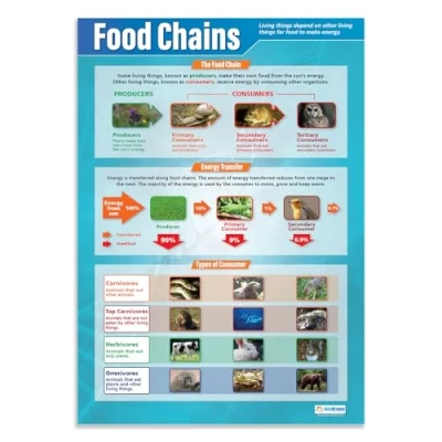 EDUCATIONAL CHART DESIGNED BY TEACHERS: Our Food Chains poster helps students to learn, engage and remember more information than ever before. Covering the basics of the relationship between producers and consumers within food chains, as well as how energy is transferred, this unique school poster can play a vital role in improving both students' understanding and classroom décor. SUPPLEMENT KNOWLEDGE: Our educational school posters are colourful, beautifully illustrated and contain a huge amount of valuable information. This Science poster is specifically designed to help students gain a greater understanding of the relationship between producers and consumers within food chains, as well as how energy is transferred. The wall chart is a great resource for Schools, Classrooms, Science Teachers, Students, Tutors, Home School Parents and Home School Kids. MAKE LEARNING FUN: Engaging, clear and colourful designs and images create a fun learning environment in which students can excel. Our amazing wall posters can help to increase students’ interest towards Science, while recapping any key information they've been taught. LARGE SIZE – IDEAL FOR READING FROM A DISTANCE: Our school wall charts are a generous size, measuring 850mm x 594mm (A1). This ensures all posters are easily readable from a distance. Our educational posters are a fantastic way of brightening and decorating any classroom and can easily complement every type of learning environment. THE UK’s NO. 1 PROVIDER: Brought to you by Daydream Education, the UK's leading provider of educational posters for schools, with a range that spans over 25 subjects across key stages 1 – 5. By combining a bold, visual approach with simple, concise information, we have provided over five million resources to more than 50,000 classrooms worldwide.