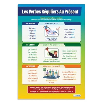 EDUCATIONAL CHART DESIGNED BY TEACHERS: Our Les Verbes Réguliers au Présent poster helps students to learn, engage and remember more information than ever before. Covering the basics of verbs in French, this unique school poster can play a vital role in improving both students' understanding and classroom décor. SUPPLEMENT KNOWLEDGE: Our educational school posters are colourful, beautifully illustrated and contain a huge amount of valuable information. The Modern Languages poster is specifically designed to help students gain a greater understanding of verbs in French. The wall chart is a great resource for Schools, Classrooms, Language Teachers, Students, Tutors, Home School Parents and Home School Kids. MAKE LEARNING FUN: Engaging, clear and colourful designs and images create a fun learning environment in which students can excel. Our amazing wall posters can help to increase students’ interest towards Modern Languages, while recapping any key information they've been taught. LARGE SIZE – IDEAL FOR READING FROM A DISTANCE: Our school wall charts are a generous size, measuring 850mm x 594mm (A1). This ensures all posters are easily readable from a distance. Our educational posters are a fantastic way of brightening and decorating any classroom and can easily complement every type of learning environment. THE UK’s NO. 1 PROVIDER: Brought to you by Daydream Education, the UK's leading provider of educational posters for schools, with a range that spans over 25 subjects across key stages 1 – 5. By combining a bold, visual approach with simple, concise information, we have provided over five million resources to more than 50,000 classrooms worldwide.