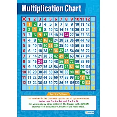 EDUCATIONAL CHART DESIGNED BY TEACHERS: Our Multiplication Chart poster helps students to learn, engage and remember more information than ever before. Covering the basics of multiplication, this unique school poster can play a vital role in improving both students' understanding and classroom décor. SUPPLEMENT KNOWLEDGE: Our educational school posters are colourful, beautifully illustrated and contain a huge amount of valuable information. The Mathematics poster is specifically designed to help students gain a greater understanding of multiplication. The wall chart is a great resource for Schools, Classrooms, Maths Teachers, Students, Tutors, Home School Parents and Home School Kids. MAKE LEARNING FUN: Engaging, clear and colourful designs and images create a fun learning environment in which students can excel. Our amazing wall posters can help to increase students’ interest towards Mathematics, while recapping any key information they've been taught. LARGE SIZE – IDEAL FOR READING FROM A DISTANCE: Our school wall charts are a generous size, measuring 594 mm x 850 mm (A1). This ensures all posters are easily readable from a distance. Our educational posters are a fantastic way of brightening and decorating any classroom and can easily complement every type of learning environment. Brought to you by Daydream Education, provider of educational posters for schools, with a range that spans over 25 subjects across key stages 1 – 5. By combining a bold, visual approach with simple, concise information, we have provided over five million resources to more than 50,000 classrooms worldwide.