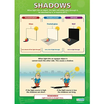 EDUCATIONAL CHART DESIGNED BY TEACHERS: Our Shadows poster helps students to learn, engage and remember more information than ever before. Covering the basics of how shadows how, this unique school poster can play a vital role in improving both students' understanding and classroom décor. SUPPLEMENT KNOWLEDGE: Our educational school posters are colourful, beautifully illustrated and contain a huge amount of valuable information. This Science poster is specifically designed to help students gain a greater understanding of how shadows work. The wall chart is a great resource for Schools, Classrooms, Science Teachers, Students, Tutors, Home School Parents and Home School Kids. MAKE LEARNING FUN: Engaging, clear and colourful designs and images create a fun learning environment in which students can excel. Our amazing wall posters can help to increase students’ interest towards Science, while recapping any key information they've been taught. LARGE SIZE – IDEAL FOR READING FROM A DISTANCE: Our school wall charts are a generous size, measuring 850mm x 594mm (A1). This ensures all posters are easily readable from a distance. Our educational posters are a fantastic way of brightening and decorating any classroom and can easily complement every type of learning environment. THE UK’s NO. 1 PROVIDER: Brought to you by Daydream Education, the UK's leading provider of educational posters for schools, with a range that spans over 25 subjects across key stages 1 – 5. By combining a bold, visual approach with simple, concise information, we have provided over five million resources to more than 50,000 classrooms worldwide.