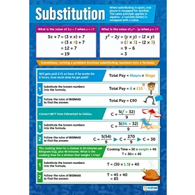 EDUCATIONAL CHART DESIGNED BY TEACHERS: Our Substitution poster helps students to learn, engage and remember more information than ever before. Covering the basics of the substitution topic, this unique school poster can play a vital role in improving both students' understanding and classroom décor. SUPPLEMENT KNOWLEDGE: Our educational school posters are colourful, beautifully illustrated and contain a huge amount of valuable information. The Mathematics poster is specifically designed to help students gain a greater understanding of the substitution topic. The wall chart is a great resource for Schools, Classrooms, Maths Teachers, Students, Tutors, Home School Parents and Home School Kids. MAKE LEARNING FUN: Engaging, clear and colourful designs and images create a fun learning environment in which students can excel. Our amazing wall posters can help to increase students’ interest towards Mathematics, while recapping any key information they've been taught. LARGE SIZE – IDEAL FOR READING FROM A DISTANCE: Our school wall charts are a generous size, measuring 594 mm x 850 mm (A1). This ensures all posters are easily readable from a distance. Our educational posters are a fantastic way of brightening and decorating any classroom and can easily complement every type of learning environment. THE UK’s NO. 1 PROVIDER: Brought to you by Daydream Education, the UK's leading provider of educational posters for schools, with a range that spans over 25 subjects across key stages 1 – 5. By combining a bold, visual approach with simple, concise information, we have provided over five million resources to more than 50,000 classrooms worldwide.