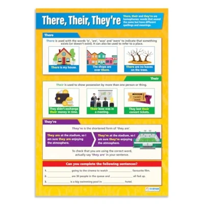 EDUCATIONAL CHART DESIGNED BY TEACHERS: Our There, Their & They're poster helps students to learn, engage and remember more information than ever before. Clearing up the confusion surrounding the usage of there, their and they're, this unique school poster can play a vital role in improving both students' understanding and classroom décor. SUPPLEMENT KNOWLEDGE: Our educational school posters are colourful, beautifully illustrated and contain a huge amount of valuable information. This English poster is specifically designed to help students clear up the confusion surrounding the usage of there, their and they're. The wall chart is a great resource for Schools, Classrooms, English Teachers, Students, Tutors, Home School Parents and Home School Kids. MAKE LEARNING FUN: Engaging, clear and colourful designs and images create a fun learning environment in which students can excel. Our amazing wall posters can help to increase students’ interest towards English, while recapping any key information they've been taught. LARGE SIZE – IDEAL FOR READING FROM A DISTANCE: Our school wall charts are a generous size, measuring 850mm x 594mm (A1). This ensures all posters are easily readable from a distance. Our educational posters are a fantastic way of brightening and decorating any classroom and can easily complement every type of learning environment. THE UK’s NO. 1 PROVIDER: Brought to you by Daydream Education, the UK's leading provider of educational posters for schools, with a range that spans over 25 subjects across key stages 1 – 5. By combining a bold, visual approach with simple, concise information, we have provided over five million resources to more than 50,000 classrooms worldwide.