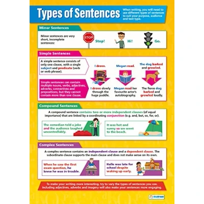 EDUCATIONAL CHART DESIGNED BY TEACHERS: Our Types of Sentences poster helps students to learn, engage and remember more information than ever before. Covering the basics of the different types of sentence structures, this unique school poster can play a vital role in improving both students' understanding and classroom décor. SUPPLEMENT KNOWLEDGE: Our educational school posters are colourful, beautifully illustrated and contain a huge amount of valuable information. This English poster is specifically designed to help students gain a greater understanding of the different types of sentences at their disposal. The wall chart is a great resource for Schools, Classrooms, English Teachers, Students, Tutors, Home School Parents and Home School Kids. MAKE LEARNING FUN: Engaging, clear and colourful designs and images create a fun learning environment in which students can excel. Our amazing wall posters can help to increase students’ interest towards English, while recapping any key information they've been taught. LARGE SIZE – IDEAL FOR READING FROM A DISTANCE: Our school wall charts are a generous size, measuring 850mm x 594mm (A1). This ensures all posters are easily readable from a distance. Our educational posters are a fantastic way of brightening and decorating any classroom and can easily complement every type of learning environment. THE UK’s NO. 1 PROVIDER: Brought to you by Daydream Education, the UK's leading provider of educational posters for schools, with a range that spans over 25 subjects across key stages 1 – 5. By combining a bold, visual approach with simple, concise information, we have provided over five million resources to more than 50,000 classrooms worldwide.