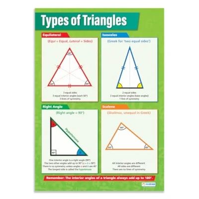 EDUCATIONAL CHART DESIGNED BY TEACHERS: Our Types of Triangles poster helps students to learn, engage and remember more information than ever before. Covering the basics of the types of triangles topic, this unique school poster can play a vital role in improving both students' understanding and classroom décor. SUPPLEMENT KNOWLEDGE: Our educational school posters are colourful, beautifully illustrated and contain a huge amount of valuable information. The Mathematics poster is specifically designed to help students gain a greater understanding of the types of triangles topic. The wall chart is a great resource for Schools, Classrooms, Maths Teachers, Students, Tutors, Home School Parents and Home School Kids. MAKE LEARNING FUN: Engaging, clear and colourful designs and images create a fun learning environment in which students can excel. Our amazing wall posters can help to increase students’ interest towards Mathematics, while recapping any key information they've been taught. LARGE SIZE – IDEAL FOR READING FROM A DISTANCE: Our school wall charts are a generous size, measuring 594 mm x 850 mm (A1). This ensures all posters are easily readable from a distance. Our educational posters are a fantastic way of brightening and decorating any classroom and can easily complement every type of learning environment. THE UK’s NO. 1 PROVIDER: Brought to you by Daydream Education, the UK's leading provider of educational posters for schools, with a range that spans over 25 subjects across key stages 1 – 5. By combining a bold, visual approach with simple, concise information, we have provided over five million resources to more than 50,000 classrooms worldwide.