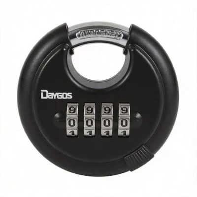 [Sturdy and Durable Padlock]: Reinforced zinc alloy body resists hammer hits, and the 9.5mm hardened steel shackle prevents bolt cutters [Easy to Use]: Set your own 4-digit code in four simple steps using a simple visual guide. Easy to secure your items for keyless ease [High Security Round Design]:Minimizes shackle exposure and allows excellent cut resistance for higher security. padlock dimensions (W x D) 7 x 2.5 cm; shackle diameter 9.5mm; One padlock [Multiple Padlock Applications]:Disc padlock is ideal for locking storage units, garages, sheds, trailers, outdoor gates, doors, moving trucks and more [Weatherproof Lock]: This combination padlock is designed for outdoor use, featuring multiple drain holes to prevent moisture buildup and provide maximum resistance to weather, making it suitable for year-round outdoor use, Manufacturer: DAYGOS