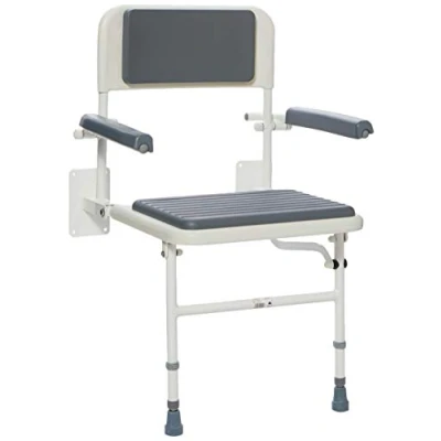Height adjustable shower chair has arms, seat and legs that easily fold away when not in use Seat width 460 mm (18 inch), seat depth 380 mm (15 inch), seat height with pad 460 to 580 mm (18 to 22¾ inch), back and seat pads are removable Aluminium frame ensures the chair is both lightweight and corrosion resistant, padded seat keeps you comfortable while showering Lift-up padded arms enable easier side transfer and the padded backrest offers additional support Wall mounted shower chair makes bathing easier for elderly, disabled and injured who can't stand while showering