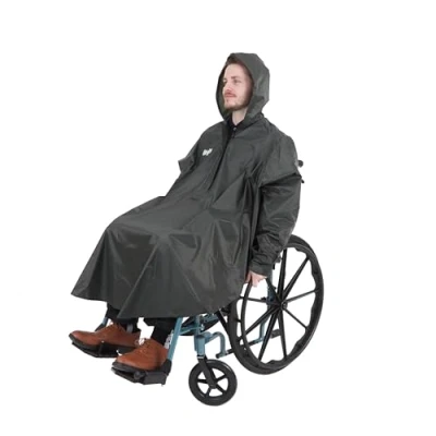 Fully Waterproof Protection – Durable waterproof fabric keeps both user and wheelchair dry in wet weather Designed for Seated Comfort – Specially shaped for wheelchair and scooter users, providing full coverage without restricting movement Full-Length Front Zip & Snug Hood – Easy to put on and remove, with added protection around the neck and head Generous Front Coverage (100cm) – Extended length helps protect legs and lap while seated Wide Fit for Maximum Coverage (133cm Width) – Ensures excellent rain protection without compromising manoeuvrability