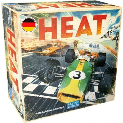 In the competitive connoisseur game Heat, you take over the cockpit of a racing car of the 1960s. There are no compromises in this race, so give full throttle until the tyres smoke The Grand Prix has begun. You get everything out of your machine and get almost into the spin. But with a firm grip on the steering wheel, you can suck through the crown of the curve, still in the lead Choose the right upgrades for your car to lie perfectly in the corner. Keep the engine cool and reach top speeds. However, the key to victory is your driving skills Experience the thrill of a single race or use the championship system to drive a whole season. Before each race, you can further improve your car 1-6 players | Ages 10+ | 60 minutes playing time per game | Authors: Asger Harding Granerud and Daniel Skjold Pedersen | Game in German, Manufacturer: Days of Wonder