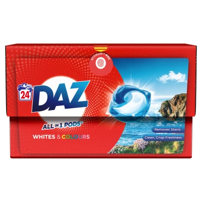 DAZ ALL in 1 PODS® Washing Capsules clean whites and colours, remove stains, and boost brightness while saving up to 60% energy by washing at lower temperatures. Each capsule is designed for convenience, eco-friendliness, and effective cleaning with built-in freshness.