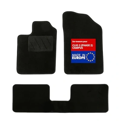 Custom-made for RENAULT Clio 2 (06/2001 to 10/2012) 2 car mats for front + 1 car mat with bridge for rear Exclusive anti-slip system : AUTOGRIP Original fixation clips Needled carpet 900g/m² - finish in velour: constructor quality