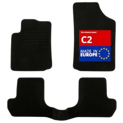 Custom-made for CITROËN C2 (09/2003 to 12/2009) 2 car mats for front + 1 car mat with bridge for rear Exclusive anti-slip system : AUTOGRIP Original fixation clips Needled carpet 900g/m² - finish in velour: constructor quality