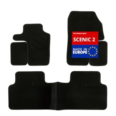 Custom-made for RENAULT Scenic 2 (03/2003 to 03/2009) 2 car mats for front + 1 car mat with bridge for rear Exclusive anti-slip system : AUTOGRIP Original fixation clips Needled carpet 900g/m² - finish in velour: constructor quality