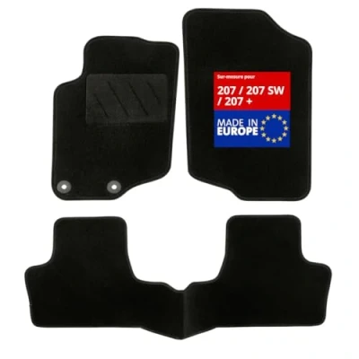 Made to measure for PEUGEOT 207 and 207SW (04/2006 to 2018). 2 mats for the front + 1 mat with bridge for the rear. Exclusive anti-slip system: AUTOGRIP. Original fastening clips. Needle carpet 900g/m² - velvet finish: high quality.