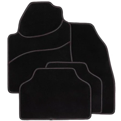 2 front mats + 2 rear mats (needle punched carpet 450 g/m² offering impeccable comfort) Design: Black textile strap and red stitching Granulated backing and non-slip Velcro for excellent support of the mats Textile heel pad with coloured stitching for effective and long-lasting protection of the mat Suitable for all vehicles, these mats will give your interior a new look and keep it from everyday wear and tear