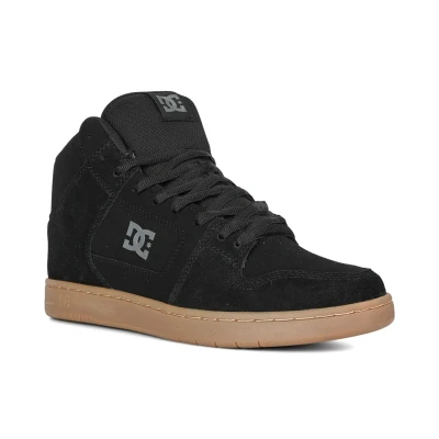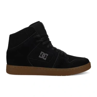 * DC Shoes Manteca 4 high-top has a classic court-styled skate shoe, with a multi-panel design that lends itself to a wide range of material make-ups and colourways * Black suede uppers with tonal-black nubuck underlays, dark grey details and a gum sole unit * Triple-stitch seams around the toe for reduced blowouts * High-top construction for added ankle support and protection * Performance cupsole unit * Tongue straps for added comfort and improved fit * DC's classic pill pattern and herringbone tread * Perforation on the toe vamp * Padding in the tongue and collar for stability and comfort * Breathable mesh lining * Branding detailing on the tongue, mid-quarter and heel