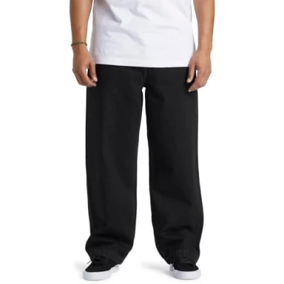 * The DC Worker Baggy denim jeans are comfy relaxed-fitting jeans with a classic skate aesthetic * Black cotton construction with subtle white stitching and a blue and yellow detail on top of the right front pocket * Low impact Environmental Impact Measurement score * Rigid 13.5oz denim fabric * 18.5" leg opening * Button Fly * Relaxed, 'unrestricted' fit with dropped crotch style fit * Materials: 80% Cotton / 20% Recycled Cotton