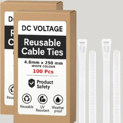 DC VOLTAGE 200 Pcs Reusable White Cable Ties, 250mm x 4.8mm, 10" Adjustable Plastic Tie Wraps HeavyDuty Releasable Strong Nylon Zip Ties for Home Office Garage and Workshop (4.8 250 mm White)